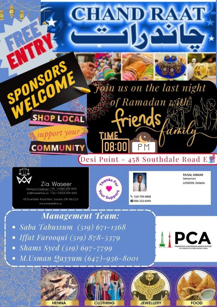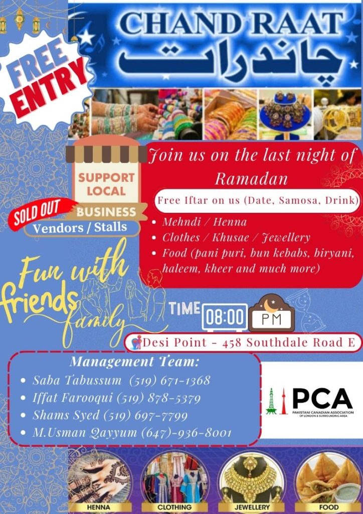 Whether you’re young or old, Pakistani or non-Pakistani, everyone is welcome to join in the festivities and experience the rich cultural heritage of Pakistan. Don’t miss out on this special occasion to celebrate Chand Raat with the Pakistani Canadian Association of London (PCA) and create lasting memories with your loved ones. We hope to see you there!